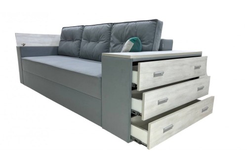 Диван оснащений механізмом розкладки, що перетворює його на повноцінне спальне місце, та місткою нішою для білизни.