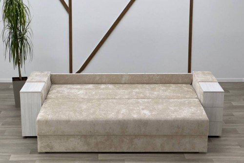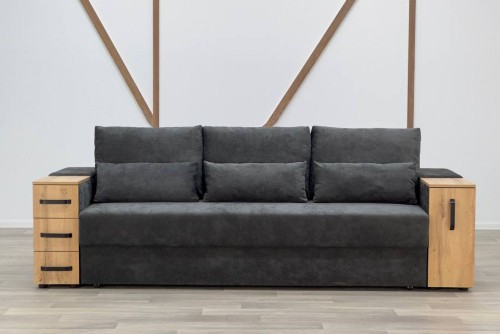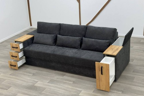 Диван оснащений механізмом розкладки, що перетворює його на повноцінне спальне місце, та місткою нішою для білизни.